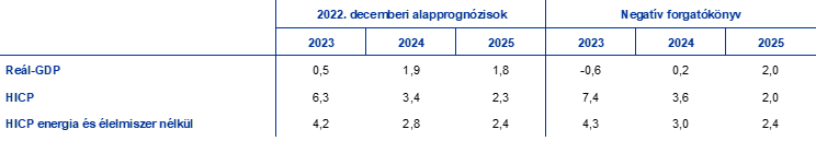 Az euroövezeti reál-GDP-növekedésre és HICP-inflációra gyakorolt hatás a negatív forgatókönyv szerint szemben a 2022. decemberi alapprognózissal