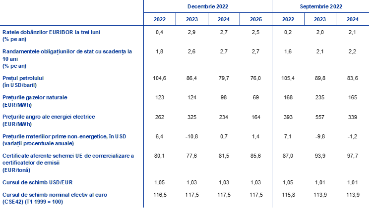 Comparativ cu proiecțiile experților BCE din luna septembrie 2022, ipotezele tehnice includ rate ale dobânzilor mai ridicate, o scădere a prețurilor petrolului, prețuri angro semnificativ mai reduse ale gazelor naturale și ale energiei electrice, precum și o apreciere a euro. Ipotezele tehnice referitoare la ratele dobânzilor și la prețurile materiilor prime se bazează pe anticipațiile pieței, data-limită pentru includerea ultimelor informații fiind 23 noiembrie 2022. Ratele dobânzilor pe termen scurt se referă la EURIBOR la trei luni, anticipațiile pieței fiind derivate din ratele dobânzilor futures. Conform acestei metodologii, ratele dobânzilor pe termen scurt se vor situa, în medie, la 0,4% în 2022, la 2,9% în 2023, la 2,7% în 2024 și la 2,5% în 2025. Anticipațiile pieței cu privire la randamentele nominale ale obligațiunilor de stat cu scadența la 10 ani din zona euro presupun un nivel mediu anual de 1,8% pentru anul 2022, care va crește progresiv pe parcursul orizontului de proiecție până la 2,7% în 2025.[4] Comparativ cu proiecțiile din luna septembrie 2022, anticipațiile pieței privind ratele dobânzilor pe termen scurt au fost revizuite în sens ascendent cu circa 20, 90 și 60 puncte de bază pentru 2022, 2023 și, respectiv, 2024, pe seama așteptărilor referitoare la o retragere mai rapidă a stimulului monetar. Aceasta a condus, de asemenea, la o revizuire în sens ascendent a randamentelor obligațiunilor de stat pe termen lung, cu circa 20-50 puncte de bază, pe parcursul orizontului de proiecție.