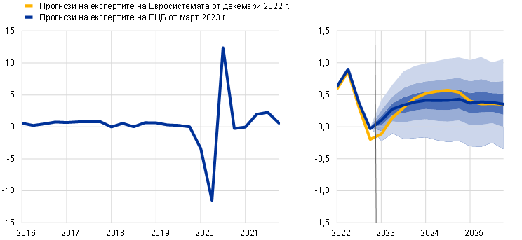 Растежът в еврозоната отбеляза застой през четвъртото тримесечие на 2022 г. поради отслабване на потреблението в резултат от голямата несигурност, високите цени на енергоносителите и ниското доверие. Въпреки това той беше изненадващо по-висок от очакваното вследствие на спада на вноса (Графика 1). Прирастът е с 0,2 процентни пункта по-висок от предвиденото в прогнозите от декември 2022 г. Причините са по-големият положителен принос на нетната търговия, отчасти отразяващ мекото време и по-слабото търсене на внос на енергия, и по-бързото преодоляване на смущенията във веригите на доставка. Промишленото производство намаля в края на годината. Това се дължи главно на енергоемките отрасли, въпреки изоставането в поръчките и отслабването на затрудненията във веригите на доставка. Резултати от проучвания сочат, че отслабването на растежа през четвъртото тримесечие е широко разпространено във всички сектори.