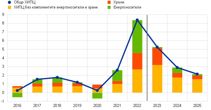Прогнозира се ХИПЦ инфлацията да бъде на средно равнище от 5,3% през 2023 г., след което да спадне до 2,9% през 2024 г. и 2,1% през 2025 г. Базовата прогноза предвижда общата инфлация да спадне от 10,0% през четвъртото тримесечие на 2022 г. до 2,8% през четвъртото тримесечие на 2023 г., после през 2024 г. да се движи около 3,0%, след което да спадне до целевото равнище от 2,0% едва през третото тримесечие на 2025 г. (Графика 4). Този спад на общата инфлация в хода на прогнозния период отразява намаляващ годишен темп на изменение на всички основни компоненти в различна степен и се влияе от мерките на фискалната политика и допусканията за цените на суровините (Графика 5).