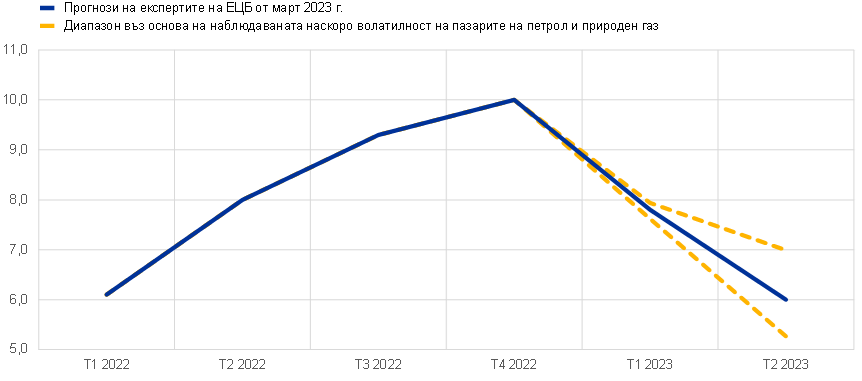 Въз основа на актуалния опит от алтернативните хипотези за цените на петрола и природния газ би следвало, че краткосрочната перспектива за ХИПЦ инфлацията би се разполагала в диапазона от 5,3% до 7,0% през второто тримесечие на 2023 г. Силната краткосрочна волатилност, наблюдавана през последната година, обикновено не се улавя от базираното на опции разпределение около фючърсите (вижте по-долу). За да се подложи на оценка такава краткосрочна чувствителност, една от възможностите е да се вземат горна и долна граница на краткосрочните колебания в цените на петрола и природния газ и въз основа на този диапазон да се направят прогнози за краткосрочната инфлация. При този анализ на чувствителността определеният диапазон за петрола е от 55 до 125 щатски долара за барел, а диапазонът, определен за цените на едро на природния газ, е от 20 до 150 евро за мегаватчас. Тези цени, за които се допуска, че ще се задържат от март 2023 г. до юни 2023 г., се включват в набора от енергийни уравнения (за горива, електроенергия и газ), използвани от експертите на ЕЦБ за прогнозиране на краткосрочната инфлация. Допусканото максимално поскъпване на петрола и природния газ би повишило общата ХИПЦ инфлация с 0,1 процентни пункта през първото тримесечие на 2023 г. и с 1,0 процентни пункта през второто тримесечие на годината в сравнение с базовата прогноза. Допусканото максимално поевтиняване на петрола и природния газ би намалило общата инфлация с 0,2 процентни пункта през първото тримесечие на 2023 г. и с 0,7 процентни пункта през второто тримесечие на годината.