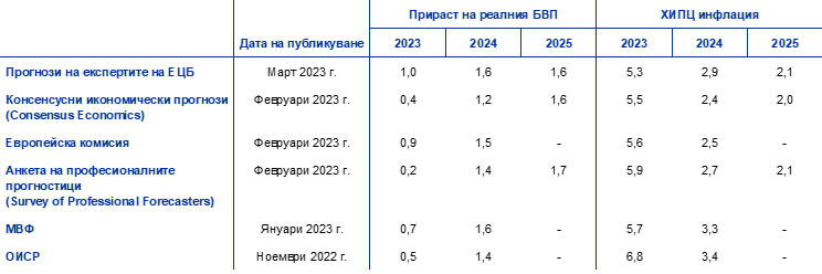 Източници: Консенсусни икономически прогнози, 16 февруари 2023 г. (данните за 2025 г. са взети от проучването от януари 2023 г.); Икономическа прогноза на Европейската комисия, зима 2023 г. (междинна), 13 февруари 2023 г.; ЕЦБ анкета на професионалните прогностици, 3 февруари 2023 г.; Актуални перспективи за световната икономика на МВФ, 30 януари 2023 г.; Икономически перспективи на ОИСР, ноември 2022 г., № 112, 22 ноември 2022 г.