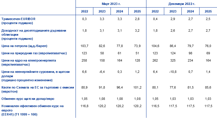 В сравнение с прогнозите от декември 2022 г. техническите допускания включват по-затегнати условия за финансиране, по-ниски цени на петрола, значително по-ниски цени на едро на природния газ и електроенергията и повишаване на обменния курс на еврото. Техническите допускания за лихвените проценти и за цените на суровините се основават на пазарните очаквания към 15 февруари 2023 г. (крайна дата). Краткосрочните лихвени проценти се отнасят до тримесечния EURIBOR, а пазарните очаквания се извеждат от фючърсните лихви. Доходността на десетгодишните държавни облигации се използва като заместител на дългосрочните лихвени проценти.[4] Както краткосрочните, така и дългосрочните лихвени проценти се повишиха след крайната дата за прогнозите от декември 2022 г. Спрямо тези прогнози траекториите им са ревизирани нагоре с 40–50 базисни пункта на фона на по-нататъшно повишаване на основните лихвени проценти на ЕЦБ и ефекти на пренос от паричните политики на други държави.
