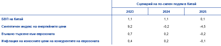 При този сценарий се разглежда по-силен подем на китайската икономика в сравнение с тенденцията, предвидена в базовата прогноза. Той би породил и покачване на международните цени на суровините. В сценария се допуска стабилно състояние по отношение на пандемията в Китай, без по-нататъшни големи вълни на заразяване с коронавирус и съответни строги ограничителни мерки. Подобна ситуация би благоприятствала по-бързо възстановяване на потребителското доверие и по-силен подем на търсенето, с положителен ефект и върху сектора на жилищните имоти. В сценария се допуска, че темпът на икономическата активност се засилва осезаемо, особено от второто тримесечие на 2023 г. нататък, като отрицателното въздействие от голямата вълна на заразяване в края на миналата година отзвучава по-бързо, отколкото е предвидено в базовата прогноза. Това би възстановило динамиката на реалния БВП на Китай до състоянието от преди пандемията, което би засилило външното търсене към еврозоната.[8] В този сценарий се предвижда също така въздействие за покачване на международните цени на суровините, особено на природния газ, вследствие на засиленото търсене от Китай, което вероятно би предизвикало по-висока инфлация на износните цени за конкурентите на еврозоната. Очаква се обаче пречупване на тези ефекти през 2025 г. (Таблица).[9]