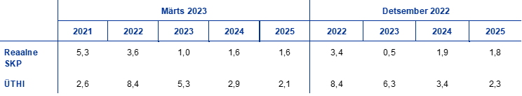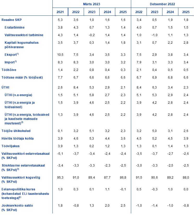 2022. aasta detsembri ettevaatega võrreldes on SKP reaalkasvu prognoosi korrigeeritud 2023. aastaks 0,5 protsendipunkti võrra ülespoole ning 2024. ja 2025. aastaks vastavalt 0,3 ja 0,2 protsendipunkti võrra allapoole. 2023. aasta prognoosi ülespoole korrigeerimine kajastab 2022. aasta teise poole üllatavalt positiivsete näitajate (mis on peamiselt seotud väiksema nõudlusega energiaimpordi järele) soodsat siirdemõju ja lühiajalise väljavaate ülespoole korrigeerimist. Ülespoole korrigeerimise põhjuseks on energiaturu oodatust kiirem kohandumine ja energiahindade inflatsiooni märkimisväärne aeglustumine ning sellega kaasnev ebakindluse vähenemine ja kindlustunde kasv, aga ka tarneahelahäirete kiire kõrvaldamine. Pikemas vaates on SKP kasvu 2024. ja 2025. aasta prognoosi allapoole korrigeeritud. Selle põhjuseks on rahapoliitika karmistumise jõulisem mõju, mille tulemusel on intressimäärasid ülespoole korrigeeritud, laenupakkumise tingimused on muutunud viimasel ajal järsult rangemaks ja euro on kallinenud. Viimane kaalub üles madalama inflatsioonimäära positiivse mõju sissetulekutele ja kindlustundele.