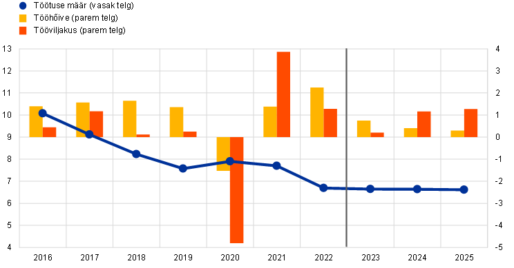 Tööturg peaks olema endiselt vastupidav ning jätkuva tööjõupuuduse tingimustes püsib töötuse määr ettevaateperioodil rekordiliselt madal (vt joonis 3). Tööhõive kasvas 2022. aasta neljandas kvartalis 0,3% hoolimata sellest, et SKP reaalkasv seiskus. Ettevaateperioodil peaks see jätkuvalt suurenema, ehkki aeglasemas tempos kui 2022. aastal (0,8% 2023. aastal, 0,4% 2024. aastal ja 0,3% 2025. aastal). Tööhõive kasv toimub olukorras, kus majanduslanguse oht lähiajal väheneb, ning samal ajal ei too reaalse aktiivsuse raugemine 2023. aastal kaasa koondamiste arvu tõusu. Selle asemel tähendab see ulatuslikumat varutööjõu hoidmist jätkuva tööjõupuuduse tingimustes. Selle tulemusel peaks tööviljakuse kasv aeglustuma 2023. aastal 0,2%ni ning hoogustuma siis 2024. aastal 1,2%ni ja 2025. aastal 1,3%ni. Tööjõu eeldatava väikese kasvu taustal peaks töötuse määr püsima kogu ettevaateperioodil praeguse 6,6% taseme lähedal.