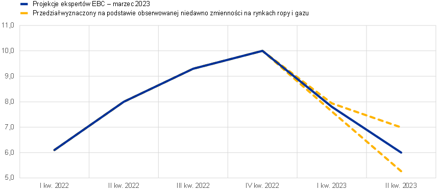 Inflacja ogółem w 2023 według oczekiwań znacznie się obniży, choć pozostanie podwyższona, pod wpływem ujemnego efektu bazy związanego z energią, spadków cen energii i coraz mniejszej presji cenowej. Do spadku inflacji ogółem powinna znacznie się przyczynić inflacja HICP cen energii, przede wszystkim z powodu dużego ujemnego efektu bazy wynikającego z silnego wzrostu cen surowców energetycznych w 2022 oraz stopniowego przekładania się zakładanych dużo niższych cen ropy, gazu i energii elektrycznej. Tym samym obniżenie się inflacji HICP cen energii w horyzoncie projekcji wynika ze spadków wszystkich jej głównych składowych (cen paliw transportowych, gazu i energii elektrycznej). Inflacja cen żywności według oczekiwań również wyraźnie spadnie wskutek zmniejszania się presji cenowej. Dynamika inflacji cen żywności nieprzetworzonej od jesieni ubiegłego roku słabnie w miarę zanikania presji na wzrost cen wynikającej z suszy w Europie. Jednocześnie presja cenowa w składowej obejmującej żywność przetworzoną nadal była znaczna, co w krótkim okresie jeszcze nasilało presję na wzrost inflacji cen żywności. Mimo to inflacja cen żywności w 2023 powinna się obniżyć dzięki stopniowemu zmniejszaniu się presji cenowej na ceny konsumpcyjne żywności wynikającemu z zakładanych malejących cen producentów rolnych, niższym cenom energii i innych czynników produkcji, a także ujemnemu efektowi bazy. Przewiduje się, że inflacja HICP z wyłączeniem cen energii i żywności w 2023 będzie stopniowo słabnąć, ponieważ zmniejszająca się presja cenowa ma przeważyć nad presją wzrostową wynikającą z coraz silniejszej dynamiki płac. W szczególności oczekuje się, że wzrostowa presja cenowa wynikająca z silnych podwyżek cen czynników produkcji i wcześniejszej deprecjacji euro zmniejszy się, do czego przyczynią się ujemny wpływ niedawnej aprecjacji euro i słabsze pośrednie oddziaływanie, biorąc pod uwagę zakładane dużo niższe ceny energii. Spodziewanemu w tym roku obniżeniu się inflacji HICP z wyłączeniem cen żywności i energii powinno sprzyjać ustępowanie presji wynikającej z wcześniejszych zatorów podażowych i efektów ponownego otwarcia gospodarki. Oczekuje się, że marże zysku, które wzrosły w 2022, także zaczną się obniżać wraz ze zmaterializowaniem się wpływu presji konkurencyjnej. Do spadku inflacji HICP z wyłączeniem cen energii i żywności początkowo przyczyni się inflacja cen nieenergetycznych towarów przemysłowych, natomiast inflacja cen usług będzie bardziej długotrwała z powodu silniejszej dynamiki płac i według oczekiwań pozostanie wysoka przez cały 2023 rok. Zmiany w wagach HICP w pierwszych miesiącach 2023 miały ujemny wpływ na inflację HICP z wyłączeniem cen energii i żywności, zaś w trzecim kwartale mają oddziaływać dodatnio, natomiast na inflację ogółem w całym 2023 roku powinny oddziaływać ujemnie.