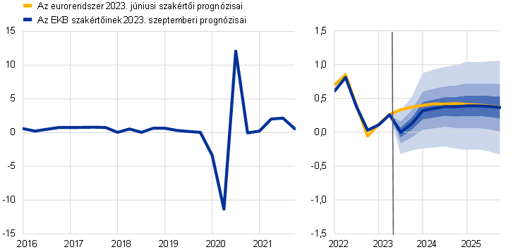 Megjegyzések: A múltbeli adatok eltérhetnek az Eurostat legutóbbi kiadványaitól (lásd még a 2. lábjegyzetet). A függőleges vonal jelzi a jelenlegi előrejelzési időszak kezdetét. A prognózis alappályáját övező, szimmetrikus szerkezetű sávok a bizonytalanság mértékét mutatják. A sávok múltbeli előrejelzési hibákon alapulnak, a kiugró értékekkel való kiigazítás után. A legsötétebbtől a legvilágosabbig a reál-GDP-növekedés adott intervallumba tartozásának 30%-os, 60%-os és 90%-os valószínűségét mutatják. További információkért lásd az EKB szakértőinek az euroövezetre vonatkozó 2023. márciusi makrogazdasági prognózisában olvasható 6. keretes írást.