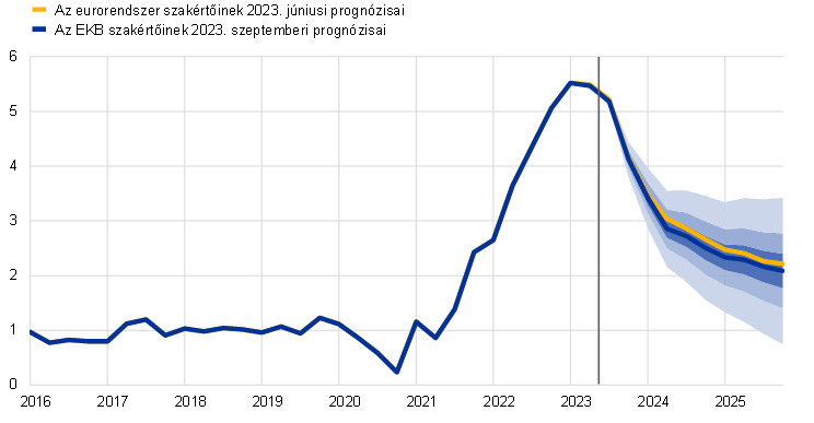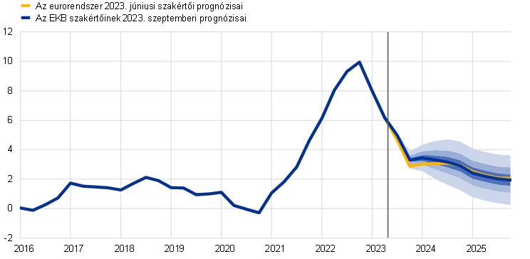 Megjegyzés: A függőleges vonal jelzi a jelenlegi előrejelzési időszak kezdetét. A HICP-inflációra vonatkozó központi prognózisok körüli sávokat a kiugró értékek miatti kiigazítás után számított múltbeli előrejelzési hibák alapján határozzuk meg. A legsötétebbtől a legvilágosabbig a HICP-inflációs eredmények adott intervallumba tartozásának 30%-os, 60%-os és 90%-os valószínűségét mutatják. További információkért lásd: Az EKB szakértőinek az euroövezetre vonatkozó 2023. márciusi makrogazdasági prognózisában olvasható 6. keretes írást.