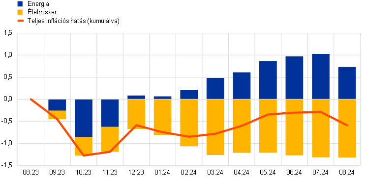 Megjegyzés: A bázishatások kumulatív hatása mindig egy adott referenciahónaphoz viszonyítva jelenik meg. Például az energia-bázishatások a 2023. augusztusi inflációs rátához képest 2024 júniusában a HICP-infláció 1,0 százalékpontos emelkedését vonnák maguk után. Hasonlóképpen, az élelmiszer-komponensből származó bázishatások magyarázzák a 2024. júniusi HICP-infláció 1,3 százalékpontos csökkenését 2023 augusztusához képest. Összefoglalva, az élelmiszer- és energia-bázishatások a 2023. augusztusi rátához képest 2024 júniusában 0,3 százalékponttal csökkentik a teljes HICP-inflációt.