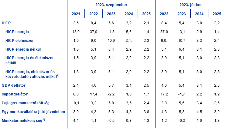 A 2023. júniusi prognózishoz viszonyítva a HICP-infláció prognózisát 2023-ra és 2024-re 0,2 százalékponttal felfelé korrigáltuk, 2025-re pedig 0,1 százalékponttal lefelé. A közelmúltbeli adatmeglepetések, a magasabb határidős olajárak és a szabályozói árak változása miatt az energiakomponenst 2023-ra és 2024-re felfelé módosítottuk. Ezeket a felfelé történő módosításokat részben ellensúlyozták az energián kívüli komponensek lefelé történő módosításai. Az élelmiszerárak inflációját 2023-ra felfelé módosítottuk elsősorban a meglepetésszerű adatok miatt, míg a 2024-re és 2025-re vonatkozó lefelé történő módosítások az euroövezeti termelői árak alacsonyabb technikai feltevéseinek tudhatók be. A HICPX-infláció 2023-ra nem módosult, de 2024-re és 2025-re lefelé korrigáltuk az euro felértékelődése és a gyengébb keresleti kilátások miatt.