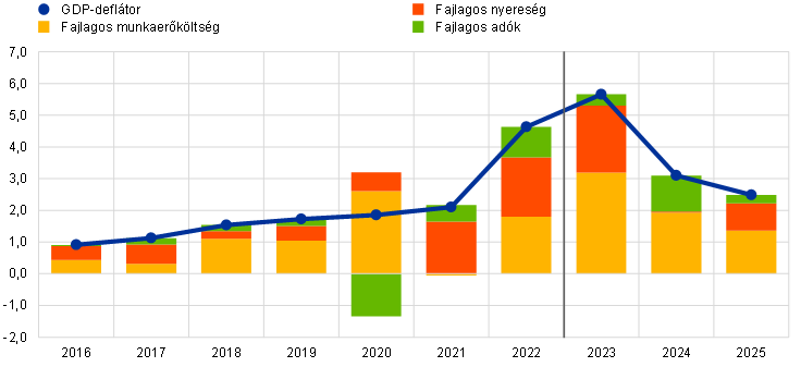 10. A GDP-deflátor bontásával és a fajlagos nyereségek inflációs elemzésben betöltött szerepével kapcsolatos további információkért lásd E. Hahn keretes írását az alábbi címmel: „How have unit profits contributed to the recent strengthening of euro area domestic price pressures?” (Hogyan járultak hozzá a fajlagos nyereségek az euroövezetben a belföldi ároldali nyomás megerősödéséhez?), Gazdasági jelentés, 4. sz., EKB, 2023; valamint Arce, O., Hahn, E. és Koester, G., „How tit-for-tat inflation can make everyone poorer” (Hogyan szegényíthet el a „fogat fogért” infláció mindenkit?), EKB-blog, 2023. március 30.