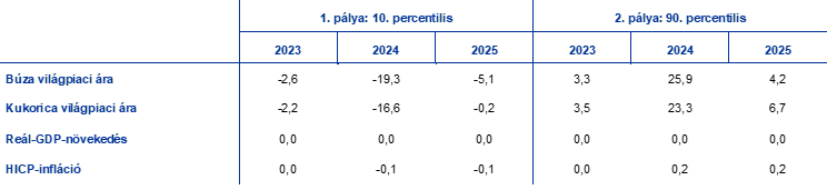 Megjegyzés: Ebben az érzékenységi elemzésben a 10. és 90. percentilis a 2023. augusztus 22-i búza- és kukoricaárak opcióalapú implikált semleges sűrűségére vonatkozik. Az opciókból számított sűrűségből adódó pályákat átalakítjuk az euroövezeti termelői árakra gyakorolt hatássá. A makrogazdasági hatások kiszámítása az eurorendszer prognózisaiban alkalmazott makrogazdasági modellek rugalmasságai alapján történik.