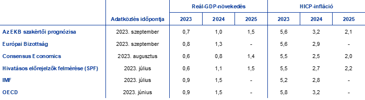 Forrás: Az Európai Bizottság 2023. nyári évközi gazdasági előrejelzése, 2023. szeptember 11.; a Consensus Economics előrejelzései, 2023. augusztus 10. (a 2025. évi adatok a 2023. júliusi felmérésből származnak); az EKB hivatásos előrejelzőkkel készített felmérése, 2023. július 28.; az IMF World Economic Outlook frissített kiadványa, 2023. július 25.; az OECD 2023. júniusi Economic Outlook 113 kiadványa, 2023. június 7.