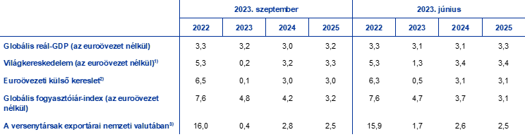A viszonylag reziliens világgazdasági teljesítmény ellenére a világkereskedelem idén várhatóan stagnál, majd az előrejelzési időszak későbbi részében helyreáll a reál-GDP-vel való múltbeli kapcsolat, ami az euroövezeti külső kereslet javulását is eredményezi. A világgazdasági növekedés jelenlegi alacsony kereskedelmi intenzitása a gazdasági teljesítmény összetételét tükrözi, részben a világjárvány utáni fellendülés természete miatt, és azzal jár, hogy a szolgáltatási tevékenység és a lakossági fogyasztás, valamint a kevésbé intenzív kereskedelmet folytató, feltörekvő piacgazdaságok nagyobb mértékben járulnak hozzá a világgazdasági növekedéshez. Emellett a globális monetáris politikai szigorítás is visszafogja a keresletet. Ennek eredményeként idén a világkereskedelem és az euroövezeti külső kereslet várhatóan csak 0,2%-kal, illetve 0,1%-kal bővül. Az előrejelzési időszak hátralévő részében a világkereskedelem növekedése várhatóan visszanyeri a lendületét, és a gazdasági teljesítménnyel nagyjából összhangban erősödik. Az euroövezeti külső kereslet növekedése a prognózis szerint 2024-ben és 2025-ben is 3%-ra emelkedik. A világpiaci importra és az euroövezeti külső keresletre vonatkozó prognózis egyaránt lefelé módosult erre az évre, nagyrészt a múltbeli adatok év végi újabb lefelé módosítása és a korábban becsültnél gyengébb második negyedévi behozatal következtében. Ugyanakkor a növekedési ütem az előrejelzési időszak hátralévő részében továbbra is nagyjából megfelel a júniusi prognózisnak.