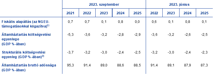 Az euroövezeti fiskális kilátások a várakozások szerint javulni fognak az előrejelzési időszakban, de a 2023. júniusi prognózisban előre jelzettnél kisebb mértékben. Az előrejelzések szerint a költségvetési hiány 2023-ban és 2024-ben tovább csökken, mégpedig a GDP 2,8%-ára csökken, de 2025-ben ismét enyhén emelkedik, a GDP 2,9%-ára. Ennek fő oka a 2023–24-es időszakban csökkenő ciklikusan kiigazított elsődleges hiány, amelyet 2025-ben stabilizáció követ, valamint a kamatfizetések GDP-arányos enyhe emelkedése. A 2023. júniusi prognózissal összevetve az előrejelzési időszak végén tapasztalt magasabb hiány a magasabb elsődleges kiadásoknak tudható be, ideértve a munkanélküli-segélyekre fordított nagyobb kiadásokat. Az euroövezet GDP-arányos államadóssága az előrejelzések szerint 2025-ben tovább csökken, 88,5%-ra, ami a kamatláb és a növekedés közötti negatív különbözeteknek tudható be, amelyek bőven ellensúlyozzák az elsődleges hiányokat és a várt pozitív hiány-adósság kiigazításokat. A júniusi prognózishoz képest az adósságráta csökkenését lefelé módosítottuk, ami főként a kamatláb-növekedés különbözetének változását tükrözi.