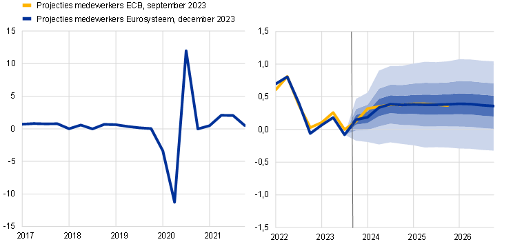 De afsluitingsdatum voor de technische aannames, zoals voor de olieprijs en de wisselkoers, was 23 november 2023. De projecties voor de wereldeconomie zijn afgerond op 23 november en de macro-economische projecties voor het eurogebied op 30 november 2023. De flashraming van de HICP voor november 2023 is in de projecties meegenomen. De huidige projecties bestrijken de periode 2023-2026. Projecties voor zo'n lange periode zijn met zeer grote onzekerheid omgeven en hiermee dient bij de interpretatie ervan rekening gehouden te worden. Zie het artikel ‘The performance of the Eurosystem/ECB staff macroeconomic projections since the financial crisis’, Economisch Bulletin, nummer 8, ECB, 2019. De aan de geselecteerde tabellen en grafieken ten grondslag liggende gegevens zijn beschikbaar op http://www.ecb.europa.eu/pub/projections/html/index.en.html. Een volledige database met eerdere macro-economische projecties door medewerkers van de ECB en het Eurosysteem is te vinden in de database met macro-economische projecties op de website van de ECB. Deze database bevat ook meer variabelen dan in dit verslag opgenomen. Vele daarvan zijn op kwartaalbasis.