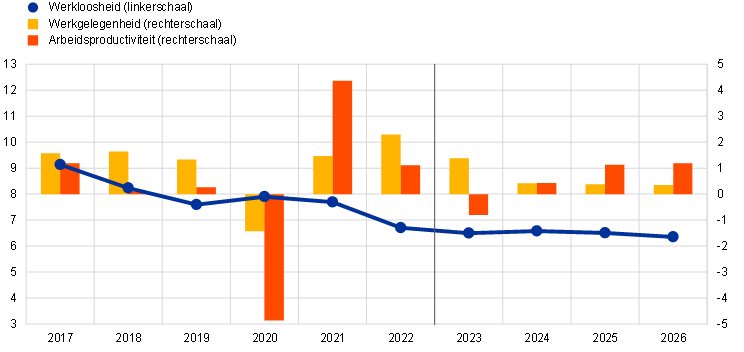 Toelichting: De gegevens zijn gecorrigeerd voor seizoensinvloeden en het aantal werkdagen. Historische cijfers kunnen afwijken van die in de meest recente Eurostat-publicaties wanneer er na de afsluitingsdatum van de projecties nog gegevens gepubliceerd zijn. De verticale lijn geeft het begin van de projectieperiode aan.