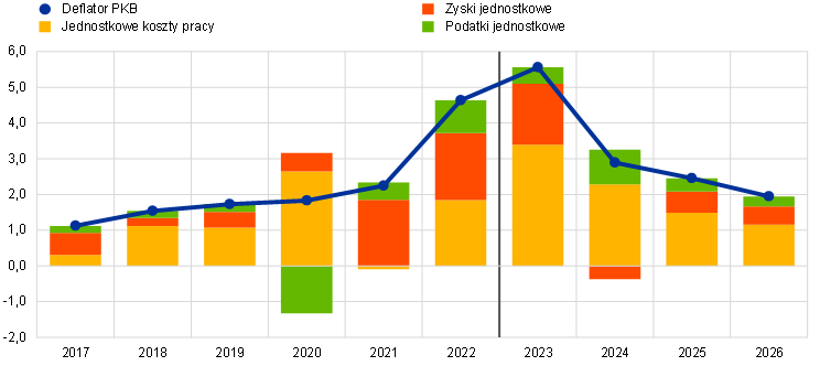 Więcej informacji na temat dekompozycji deflatora PKB i roli zysków jednostkowych w analizie inflacji można znaleźć w następujących publikacjach: E. Hahn, ramka „How have unit profits contributed to the recent strengthening of euro area domestic price pressures?”, Economic Bulletin, nr 4, EBC, 2023, a także O. Arce, E. Hahn i G. Koester, „How tit‑for‑tat inflation can make everyone poorer”, blog EBC, 30 marca 2023.