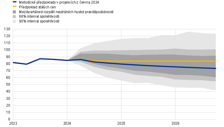 Poznámky: Metodické předpoklady o úrokových sazbách v eurozóně a cenách komodit vycházejí z tržních očekávání s datem pro uzávěrku údajů 15. května 2024. Předpoklady ohledně krátkodobých úrokových sazeb vycházejí z tržních očekávání tříměsíční sazby EURIBOR, jak naznačují sazby futures. Předpoklady nominálních výnosů z desetiletých státních dluhopisů v eurozóně vycházejí z průměru výnosů desetiletých dluhopisů těchto zemí váženého hodnotami ročního HDP. Existují-li potřebné údaje, jsou nominální výnosy desetiletých státních dluhopisů jednotlivých zemí definovány jako výnosy referenčních desetiletých dluhopisů prodloužené za použití forwardových nominálních výnosů odvozených k datu uzávěrky z odpovídajících výnosových křivek jednotlivých zemí. V případě ostatních zemí jsou výnosy desetiletých státních dluhopisů jednotlivých zemí definovány jako výnos referenčních desetiletých dluhopisů prodloužený za použití konstantního rozpětí (pozorovaného k datu uzávěrky) při metodickém předpokladu bezrizikové dlouhodobé úrokové sazby v eurozóně. Vývoj mezinárodních cen komodit naznačují trhy s futures v deseti pracovních dnech končících dnem uzávěrky. Ceny ropy se týkají spotových cen a cen futures ropy Brent. Ceny plynu se týkají spotových cen a cen futures plynu na nizozemské burze TTF. Ceny elektřiny se týkají průměrné velkoobchodní spotové ceny a ceny futures v pěti největších zemích eurozóny. „Syntetická“ budoucí cena povolenek v systému EU pro obchodování s emisemi (dále též „EUA“) se odvozuje jako lineární interpolovaná hodnota dvou nejbližších futures na EUA na Evropské energetické burze ke konci měsíce. Měsíční ceny futures EUA jsou poté průměrovány tak, aby dosáhly stejné roční frekvence. Dvoustranné směnné kurzy by měly v horizontu projekcí zůstat beze změny, a to na průměrné úrovni platné během deseti pracovních dnů končících dnem uzávěrky. Revize jsou vyjádřeny v procentech v případě úrovní, v procentních bodech v případě tempa růstu a v p. a.