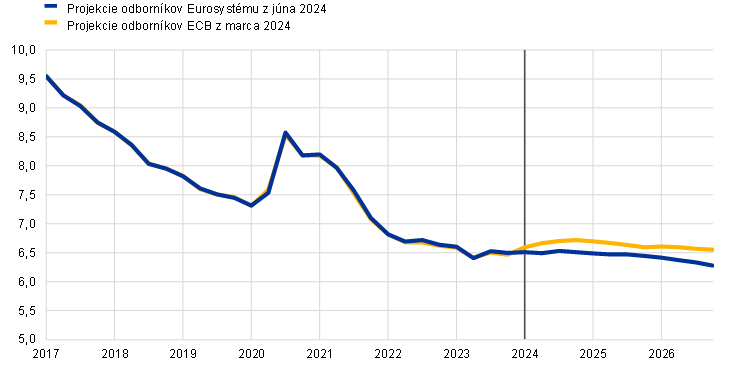 Celková inflácia by sa mala podľa projekcií v najbližšom období vyvíjať prevažne horizontálne a v priebehu roka 2025 by sa mala ďalej zmierniť až do blízkosti cieľovej úrovne. Je to odrazom ústupu nákladových tlakov, i zo strany pracovnej sily, a oneskoreného vplyvu predchádzajúceho sprísňovania menovej politiky, ktoré sa postupne premieta do spotrebiteľských cien. Celková inflácia meraná harmonizovaným indexom spotrebiteľských cien (HICP) by mala počas zvyšku roka 2024 vykazovať určitú volatilitu v dôsledku bázických efektov a vyšších cien energetických komodít. V strednodobom horizonte by sa inflácia cien energií mala ustáliť na nízkej kladnej úrovni vzhľadom na očakávania trhu týkajúce sa budúceho vývoja cien ropy a zemného plynu a plánované rozpočtové opatrenia súvisiace s klimatickými zmenami. V posledných štvrťrokoch dochádza k výraznému poklesu inflácie cien potravín vďaka uvoľňovaniu tlakov v dodávateľskom reťazci v dôsledku nižších cien energií a potravinových komodít. Pokiaľ ide o ďalší vývoj, inflácia cien potravín by sa mala pohybovať okolo súčasnej úrovne a od konca roka 2025 by mala ďalej klesať. Inflácia HICP bez energií a potravín (HICPX) by mala zostať nad úrovňou celkovej inflácie po väčšinu sledovaného obdobia. Očakáva sa však pokračovanie jej dezinflačného trendu, hoci len pomalým tempom a najmä v rokoch 2025 a 2026. Základným predpokladom tejto projekcie je očakávané postupné zmierňovanie rastu nominálnych miezd z pôvodne stále zvýšených úrovní v dôsledku zmenšovania vplyvu rastových tlakov inflačnej kompenzácie na napätom trhu práce. Očakávané oživenie rastu produktivity by malo prispieť k zmierneniu tlakov vyplývajúcich z nákladov práce. Rast ziskov by sa mal navyše spomaľovať a čiastočne tlmiť prenos nákladov práce do cien, najmä v roku 2024. Ročná priemerná celková inflácia HICP má klesnúť z 5,4 % v roku 2023 na 2,5 % v roku 2024, 2,2 % v roku 2025 a 1,9 % v roku 2026. V porovnaní s projekciami z marca 2024 bola projekcia inflácie HICP na roky 2024 a 2025 upravená o 0,2 percentuálneho bodu nahor. Dôvodom sú najmä vyššie ceny energetických komodít a o niečo vyššie než očakávané nové údaje o inflácii HICPX. Okrem toho sa očakáva, že tlaky prameniace z nákladov práce budú o niečo vyššie v dôsledku rýchlejšieho rastu miezd v spojení s o niečo opatrnejším výhľadom rastu produktivity. Výhľad celkovej inflácie i inflácie HICPX na rok 2026 zostáva nezmenený.