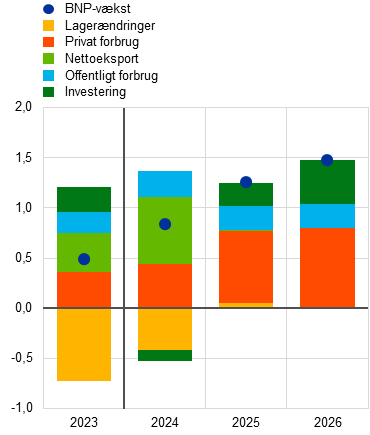 De seneste data tyder på en svækkelse af vækstudsigterne i euroområdet, men et forbrugsdrevet opsving er stadig det centrale scenarie. Væksten rettede sig i 1. halvår 2024 på baggrund af øget nettohandel. De seneste indikatorer tyder på, at væksten vil fortsætte på kort sigt, men med lavere vækstrater end forventet i Eurosystemets stabs fremskrivninger fra juni 2024. Den disponible realindkomst bør fortsætte med at stige, understøttet af en robust lønvækst. Sammen med en gradvis stigende tillid vil dette understøtte et forbrugsdrevet opsving. Impulsen fra forbruget er dog noget svagere end forventet i junifremskrivningerne, idet nye tal og de seneste konjunkturbarometre peger i retning af en fortsat afdæmpet forbrugertillid og planer om højere opsparing blandt husholdningerne. De seneste tal for erhvervsinvesteringerne tyder også på en svagere vækstudvikling. Den indenlandske efterspørgsel vil ikke desto mindre blive understøttet af aftagende effekter af tidligere pengepolitiske stramninger og en antaget fortsat lempelse af finansieringsforholdene i overensstemmelse med markedets forventninger til den fremtidige renteudvikling. Desuden bidrager en ventet stigning i den udenlandske efterspørgsel positivt til udsigterne for euroområdets eksport. Arbejdsmarkedet anses fortsat for at være robust, idet arbejdsløsheden forventes at forblive på et historisk lavt niveau. Efterhånden som effekten af nogle af de konjunkturbestemte faktorer, der tidligere har dæmpet produktivitetsvæksten, aftager, forventes produktiviteten at stige i fremskrivningsperioden. Samlet set forventes den gennemsnitlige årlige vækst i realt BNP at ligge på 0,8 pct. i 2024 og at stige til 1,3 pct. i 2025 og 1,5 pct. i 2026. Sammenlignet med junifremskrivningerne er udsigterne for BNP-væksten blevet nedjusteret en smule for hvert år i fremskrivningsperioden.[1]