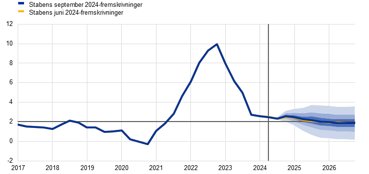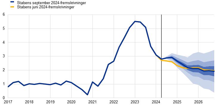 Efter den seneste afdæmpning ventes den samlede inflation at stige en del i årets sidste kvartal, inden den falder yderligere til inflationsmålet ved udgangen af 2025. Den forventede stigning på kort sigt afspejler i høj grad energibasiseffekter. På mellemlangt sigt ventes energiinflationen at stabilisere sig på et lavt, positivt niveau i lyset af markedsforventningerne til energiråvare- og -engrospriserne og de planlagte klimarelaterede finanspolitiske tiltag. Fødevareinflationen er faldet kraftigt i de seneste kvartaler, i takt med at presset på forsyningskæden er aftaget som følge af lavere råvarepriser på energi og fødevarer. Fødevareinflationen forventes stort set at bevæge sig sidelæns, før den aftager yderligere fra udgangen af 2025 og frem. HICP-inflationen ekskl. energi og fødevarer (HICPX) forventes at ligge over den samlede inflation i næsten hele fremskrivningsperioden, men at fortsætte den disinflationære udvikling. Prisstigningerne på tjenesteydelser har fortsat ligget på et højt niveau i de seneste måneder. Der forventes dog stadig et gradvist fald senere i fremskrivningsperioden, hvor lønvæksten og andre omkostningspres aftager, mens den forsinkede effekt af tidligere pengepolitiske stramninger fortsat slår igennem på forbrugerpriserne. I de seneste kvartaler er den nominelle lønvækst begyndt at falde fra et højt niveau og kraftigere end tidligere ventet. Lønvæksten ventes at aftage gradvist yderligere i de kommende år, i takt med at de opadrettede effekter fra inflationskompensation på et stramt arbejdsmarked fortsat aftager. Et opsving i produktivitetsvæksten forventes at understøtte det aftagende pres på arbejdsomkostningerne. Desuden er indtjeningsvæksten faldet markant og vil delvis afbøde gennemslaget fra arbejdsomkostningerne til priserne, især på kort sigt. Alt i alt ventes den samlede HICP-inflation at falde fra 5,4 pct. i 2023 til 2,5 pct. i 2024, 2,2 pct. i 2025 og 1,9 pct. i 2026. Sammenlignet med stabens fremskrivninger fra juni 2024 er udsigterne for HICP-inflationen uændrede. HICPX-inflationen overraskede en smule positivt i de seneste måneder, hvilket har ført til mindre opjusteringer for 2024 og 2025.