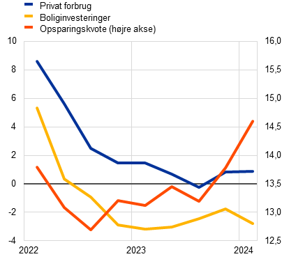 a) Privat forbrug, boliginvesteringer og opsparingskvote