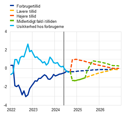 Anm.: I panel b) er dataene standardiseret for hele det udsnit, der foreligger – fra januar 1999 til august 2024 for tilliden og fra april 2019 til juli 2024 for usikkerheden. Den stiplede blå linje henviser til en fremskrivning af forbrugertilliden, som er i overensstemmelse med basisfremskrivningerne, ved hjælp af den empiriske model, der er beskrevet i figur B. De alternative udviklingsmønstre for forbrugertilliden, som fremgår af figuren, er beskrevet nedenfor. Den lodrette linje i panel b) angiver starten på den aktuelle fremskrivningsperiode. De seneste observationer vedrører 1. kvartal 2024 for panel a) og august 2024 for panel b).
