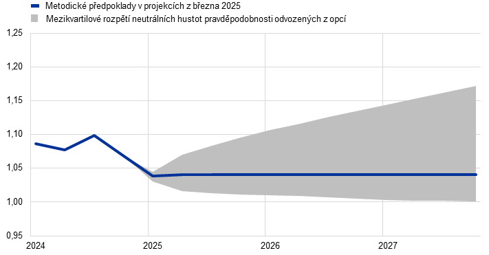 Tato citlivostní analýza posuzuje dopady alternativních scénářů vývoje směnného kurzu na základní projekce. Tyto scénáře obecně naznačují rizika zpomalení hospodářského růstu a inflace. Metodické předpoklady pro směnné kurzy uvedené v základním scénáři projekcí jsou v horizontu projekcí považovány za konstantní. Alternativní scénáře vývoje poklesu a růstu vycházející z 25. a 75. percentilu neutrálních hustot pravděpodobnosti odvozených z opcí pro směnný kurz USD/EUR ke dni 6. února 2025 ukazují na rizika posilování eura ve srovnání se základní projekcí (graf 16). Dopady těchto alternativních trajektorií jsou hodnoceny pomocí makroekonomických modelů odborníků ECB a Eurosystému. Průměrný dopad na hospodářský růst a inflaci napříč těmito modely je uveden v tabulce 7.