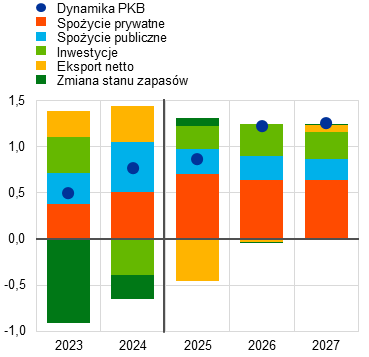 Na wzrost gospodarczy w strefie euro według przewidywań niekorzystnie wpływać będzie utrzymująca się wysoka niepewność dotycząca sytuacji geopolitycznej oraz polityki gospodarczej i handlowej, co spowolni oczekiwane ożywienie. Jest to następstwem nieco słabszego, niż przewidywano, wzrostu gospodarczego pod koniec 2024. Niepewność związana z polityką zarówno wewnętrzną, jak i handlową jest wysoka. Choć w projekcjach bazowych uwzględniono jedynie wpływ nowych ceł w handlu między Stanami Zjednoczonymi a Chinami, to zakłada się, że na eksporcie i inwestycjach w strefie euro odbiją się negatywne skutki niepewności dotyczącej możliwych dalszych zmian w światowej polityce handlowej, zwłaszcza wobec Unii Europejskiej. Ocenia się, że w połączeniu z utrzymującymi się wyzwaniami w zakresie konkurencyjności doprowadzi to do dalszego spadku udziału strefy euro w rynkach eksportowych. Mimo tych niekorzystnych czynników nadal panują warunki umożliwiające ponowne zwiększenie się dynamiki PKB w strefie euro w horyzoncie projekcji. Oczekuje się, że ożywieniu będą sprzyjać rosnące płace realne i wzrost zatrudnienia – przy silnym, choć spowalniającym, rynku pracy – a jednym z kluczowych czynników pobudzających wzrost pozostanie spożycie. Popyt wewnętrzny powinno także wspierać łagodzenie warunków finansowania, odzwierciedlone w oczekiwaniach rynku dotyczących przyszłej ścieżki stóp procentowych. Rynek pracy ma pozostać odporny – według oczekiwań stopa bezrobocia wyniesie średnio 6,3% w 2025, po czym obniży się do 6,2% w 2027. Przewiduje się, że produktywność w horyzoncie projekcji będzie rosnąć w miarę wygasania niektórych czynników cyklicznych, które w ostatnim okresie osłabiały jej dynamikę. Utrzymują się jednak problemy strukturalne. W sumie średnioroczna dynamika realnego PKB według oczekiwań wyniesie 0,9% w 2025, a następnie wzrośnie do 1,2% w 2026 i 1,3% w 2027. W porównaniu z projekcjami makroekonomicznymi ekspertów Eurosystemu z grudnia 2024 perspektywy wzrostu PKB na 2025 i 2026 zrewidowano w dół o 0,2 pkt proc., ale na 2027 pozostawiono bez zmian. Słabsze perspektywy wynikają głównie z rewizji w dół eksportu i – w mniejszym stopniu – obniżenia projekcji inwestycji. Te rewizje są odzwierciedleniem silniejszego, niż uprzednio zakładano, wpływu niepewności, a także oczekiwań, że wyzwania związane z konkurencyjnością prawdopodobnie utrzymają się dłużej, niż wcześniej przewidywano[1].
