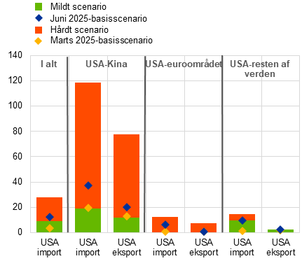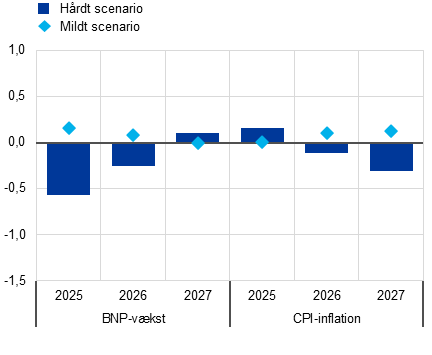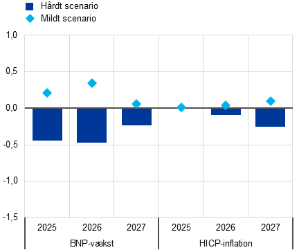 For at illustrere de risici, der er forbundet med den amerikanske toldpolitik, og den aktuelle store usikkerhed om de økonomiske udsigter for euroområdet er der udarbejdet to scenarier. I et mildt scenario ventes de bilaterale toldsatser mellem USA og EU at blive fjernet (dvs. "gensidig nultold"), og samtidig ventes en hurtig reduktion af den handelspolitiske usikkerhed til niveauet før 2018. I et sådant scenario vil væksten være 0,3-0,4 procentpoint stærkere i 2025-26 end i basisscenariet, mens inflationen vil være marginalt højere i 2026-27. I et hårdt scenario ventes der en yderligere stigning i de amerikanske toldsatser over hele linjen (i overensstemmelse med meddelelsen om såkaldte "gensidige" toldsatser i USA), symmetrisk gengældelse fra EU's side og vedvarende større handelspolitisk usikkerhed. I et sådant scenario vil vækstudsigterne blive betydeligt svagere i hele fremskrivningsperioden, mens inflationen bliver lavere – især senere i fremskrivningsperioden. Disse scenarier er beskrevet nærmere i boks 2.