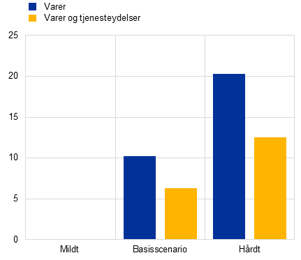 I modsætning til basisscenariet og det milde scenario omfatter det hårde scenario ikke midlertidige toldfritagelser. Det betyder, at varer med midlertidige undtagelser antages at være underlagt de almindelige amerikanske toldsatser, der blev meddelt 2. april.