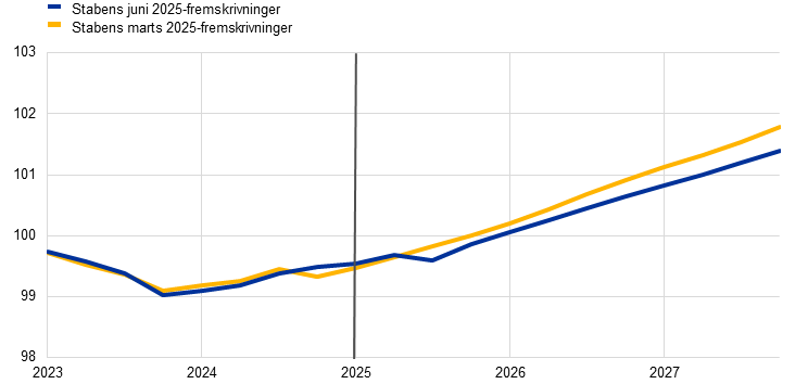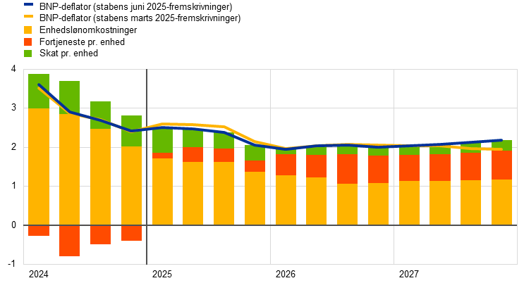 Den samlede inflation, målt ved det harmoniserede forbrugerprisindeks (HICP), vil sandsynligvis holde sig under 2 pct. på kort sigt, men den forventes igen at nå målet på mellemlangt sigt. Inflationen forventes at falde i løbet af 2025 og nå et lavpunkt på 1,4 pct. i 1. kvartal 2026, inden den igen stiger til 2,0 pct. i 2027. Nedgangen i den samlede inflation i løbet af 2025 skyldes til dels en negativ energiinflation efter det seneste fald i oliepriserne og engrospriserne på naturgas. Energiinflationen ventes at forblive negativ indtil 2027, hvor nye foranstaltninger til modvirkning af klimaændringer træder i kraft i forbindelse med det nye emissionshandelssystem (ETS2). Efter en midlertidig stigning i 2. kvartal 2025 forventes fødevareinflationen at falde til lidt over 2 pct. i 2027. HICP-inflationen ekskl. energi og fødevarer (HICPX) forventes at falde som følge af tjenesteydelseskomponenten, efterhånden som virkningen af forsinkede prisjusteringer for nogle varer aftager, lønpresset aftager, og lavere energipriser slår igennem i priskæden. Lønvæksten ventes fortsat at følge den nedadgående tendens, efterhånden som presset for at genvinde tidligere tab af realløn aftager. Sammen med en genopretning af produktivitetsvæksten forventes dette at føre til en betydeligt langsommere vækst i enhedslønomkostningerne. Det eksterne prispres, som afspejles i importpriserne, forventes at forblive moderat, idet det antages, at EU's toldpolitik forbliver uændret med et vist nedadrettet pres fra den stærkere euro og faldet i råvarepriserne på energi i de seneste måneder. Sammenlignet med fremskrivningerne fra marts 2025 er udsigterne for den samlede HICP-inflation blevet nedjusteret med 0,3 procentpoint for både 2025 og 2026 på grund af antagelserne om lavere råvarepriser på energi og apprecieringen af euroen, mens de ikke er justeret for 2027.