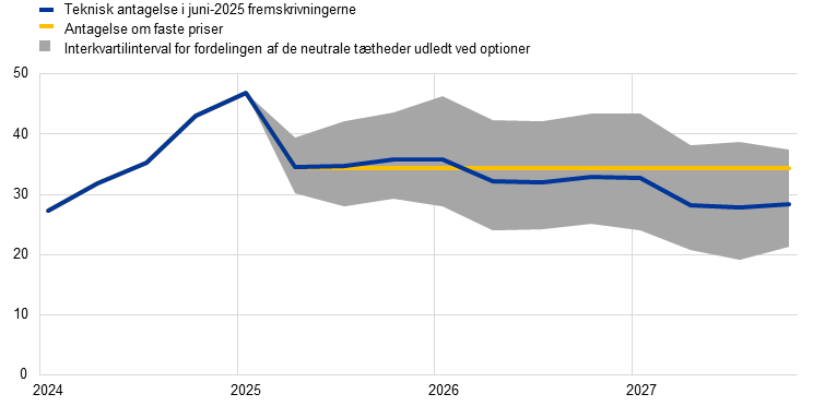 Sammenlignet med fremskrivningerne fra marts 2025 er de vigtigste ændringer af de tekniske antagelser markant lavere råvarepriser, en betydeligt stærkere eurokurs og højere lange renter. Antagelserne om oliepriserne er blevet nedjusteret med næsten 11 pct. for 2025-26, idet oliepriserne falder yderligere på kort sigt, inden de stiger svagt fra begyndelsen af 2026, hvilket indebærer et opadrettet pres på inflationen i 2027. Antagelsen om engrospriserne på gas er blevet nedjusteret med 24,4 pct. for 2025, med 17,6 pct. for 2026 og med 7,7 pct. for 2027. Euroen er apprecieret med 8,3 pct. over for den amerikanske dollar og den nominelle effektive eurokurs med 3,9 pct. siden de foregående fremskrivninger. Antagelserne om de korte renter er stort set uændrede, mens antagelserne om de lange renter i gennemsnit er blevet opjusteret med ca. 30-40 basispoint for 2025-27.