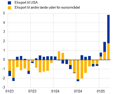 Anm.: For del a) er den seneste observation april 2025. For del b) er de underliggende data sæsonkorrigeret. Da der ikke forelå tal for euroområdets eksportmængder for marts 2025 på skæringsdatoen, estimeres det seneste datapunkt ved at deflatere værdierne for marts med industriens eksportpriser. De seneste observationer er for marts 2025.