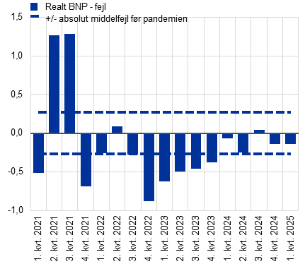 Anm.: Fejl defineres som det faktiske resultat for et givet kvartal minus fremskrivningen fire kvartaler tidligere (fx realtidsresultatet for 4. kvartal 2022 minus fremskrivningen fra ECB's stabs makroøkonomiske fremskrivninger fra december 2021).