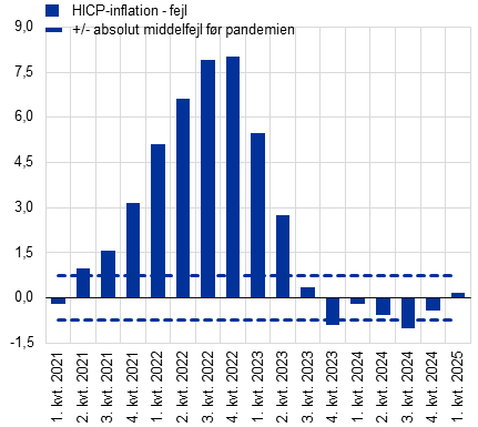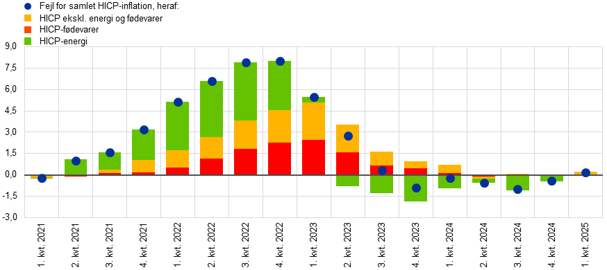 Alt i alt er fremskrivningsfejlene blevet mindre siden 2. halvår 2023, idet Eurosystemets/ECB's stabs fremskrivninger generelt har klaret sig godt, men på grund af de aktuelle stød, der rammer euroområdet, er det fortsat en udfordring at udarbejde prognoser. Fejlene var særligt store i 2021 og 2022, hvilket afspejlede virkningen af ekstraordinære og overlappende stød. Siden da er prognosernes nøjagtighed forbedret, især for inflationen ekskl. energi og fødevarer, i takt med at disse stød gradvis forsvinder. 2024 er et eksempel på, at fremskrivningsfejlene for inflationen trods visse over- og undervurderinger har ligget inden for historisk normale grænser. Når det er sagt, er det stadig en stor udfordring at udarbejde prognoser på grund af de aktuelle stød, der påvirker de økonomiske udsigter både globalt og for euroområdet. Det kræver fortsat forsigtighed og smidighed i prognoseprocessen, især i lyset af den store usikkerhed om udviklingen i og transmissionen af disse stød.