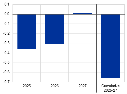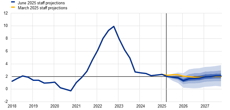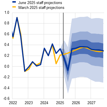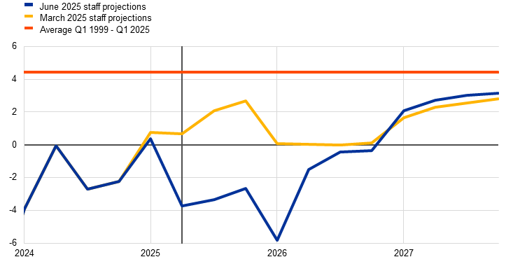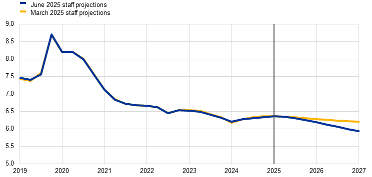The outlook for euro area economic growth is clouded by trade tensions and elevated global uncertainty. For 2025 as a whole, these effects are seen to be partly compensated by stronger than expected economic activity in the first quarter, which likely reflects in part the frontloading of exports in anticipation of higher tariffs. In the medium term economic activity is seen to be supported by the recently announced new fiscal measures. The baseline assumes that US tariffs on EU goods, which have increased to 10%, will remain in place over the entire projection horizon. Together with the elevated trade policy uncertainty and the recent appreciation of the euro, the higher tariffs will weigh on euro area exports and investment, and, to a lesser extent, on consumption. By contrast, new government spending on infrastructure and defence, mainly in Germany, should bolster euro area domestic demand from 2026. Overall, the conditions remain in place for euro area GDP growth to strengthen over the projection horizon. In particular, rising real wages and employment, less restrictive financing conditions – mainly reflecting recent monetary policy decisions – and a rebound in foreign demand later in the horizon should all support a gradual recovery. Annual average real GDP growth is expected to be 0.9% in 2025, 1.1% in 2026 and 1.3% in 2027. Compared with the March 2025 ECB staff macroeconomic projections, the outlook for GDP growth is unrevised for 2025, reflecting better than expected incoming data which are seen to be largely offset by the effects of the trade tensions and the appreciation of the euro exchange rate. The trade tensions and the stronger exchange rate have resulted in a downward revision to growth for 2026, while growth is unrevised for 2027.[1]