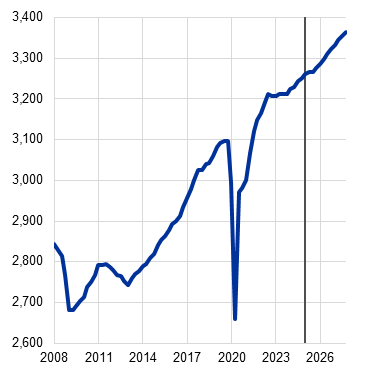 Euro area foreign demand has also been significantly revised down compared with the March projections. Growth in euro area foreign demand is expected to decline to 2.8% in 2025, from 3.5% in 2024, and to weaken further to 1.7% in 2026, before recovering to 3.1% in 2027. Compared with the March 2025 projections, euro area foreign demand growth has been significantly revised down, by 0.4 percentage points for 2025 and by 1.4 percentage points for 2026. These revisions also relate to the impact of trade displacement between the United States and China owing to higher tariffs, which does not accurately reflect potential foreign demand directed to the euro area. When the estimated impact of lower bilateral trade between the United States and China, owing to changes in tariffs since the March 2025 projections, is accounted for, downward revisions to growth in euro area foreign demand are smaller.