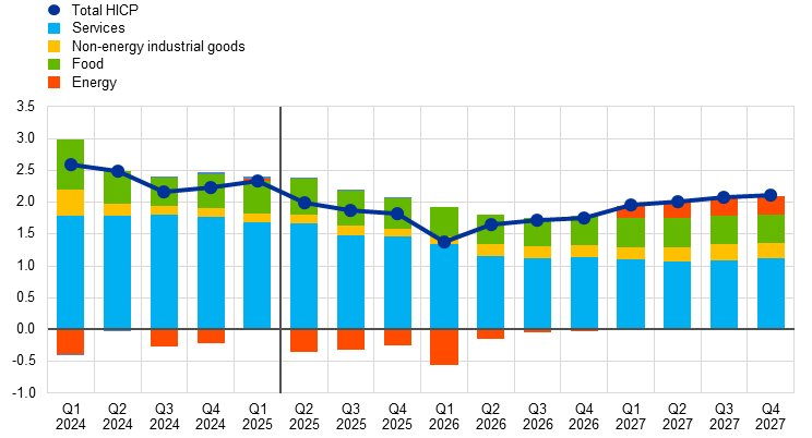 While headline inflation, as measured by the Harmonised Index of Consumer Prices (HICP), is likely to stay below 2% in the near term, it is expected to return to target in the medium term. Inflation is projected to decline in the course of 2025 and to reach a trough of 1.4% in the first quarter of 2026, before returning to 2.0% in 2027. The decline in headline inflation over 2025 is seen to be driven in part by negative energy inflation following the recent decline in oil prices and wholesale natural gas prices. Energy inflation is expected to remain negative until 2027 when new climate change mitigation measures come into effect in the context of the new Emissions Trading System (ETS2). Following a temporary increase in the second quarter of 2025, food inflation is expected to fall to rates slightly above 2% in 2027. HICP inflation excluding energy and food (HICPX) is expected to decline, driven by the services component, as the effects of delayed price adjustments for some items fade out, wage pressures recede, and lower energy prices feed through the pricing chain. Wage growth should continue to follow its downward path as pressures to recoup past real wage losses fade. Coupled with a recovery in productivity growth, this is expected to lead to significantly slower unit labour cost growth. External price pressures, as reflected in import prices, are expected to remain moderate assuming that EU tariff policies remain unchanged, with some downward pressure stemming from the stronger euro and the decline in energy commodity prices over recent months. Compared with the March 2025 projections, the outlook for headline HICP inflation is revised down by 0.3 percentage points for both 2025 and 2026 on account of lower energy commodity price assumptions and the appreciation of the euro, while it is unrevised for 2027.