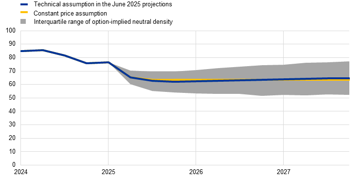 Compared with the March 2025 projections, the main changes to the technical assumptions are notably lower commodity prices, a significantly stronger exchange rate, and higher long-term interest rates. Oil price assumptions have been revised down by almost 11% for 2025-26, with oil prices declining further in the short term before increasing slightly from the beginning of 2026, implying upward pressures on inflation in 2027. The assumption for wholesale gas prices has been revised down by 24.4% for 2025, by 17.6% in 2026 and by 7.7% in 2027. The euro has appreciated by 8.3% against the US dollar and by 3.9% in nominal effective terms since the previous projections. The assumptions for short-term interest rates are broadly unchanged, whereas those for long-term interest rates have been revised up by around 30-40 basis points on average over 2025-27.