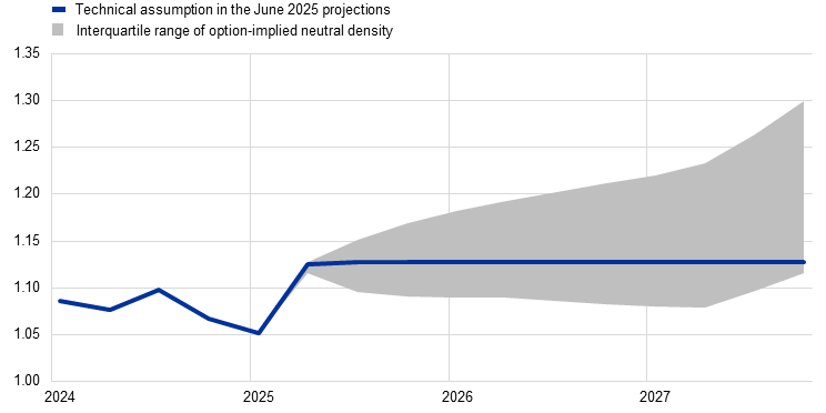 This sensitivity analysis assesses implications for the baseline projections of alternative paths for the exchange rate, which in general indicate downside risks to growth and inflation. The technical assumptions for exchange rates in the projections baseline are held constant over the projection horizon. Alternative downside and upside paths are derived from the 25th and 75th percentiles of option-implied neutral densities for the USD/EUR exchange rate on 14 May 2025, which was tilted towards a notable further appreciation of the euro (Chart 16). The impacts of these alternative paths are assessed using the ECB and Eurosystem staff macroeconomic models. The average impact on output growth and inflation across these models is shown in Table 7.