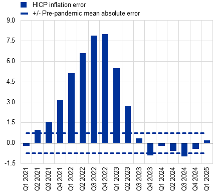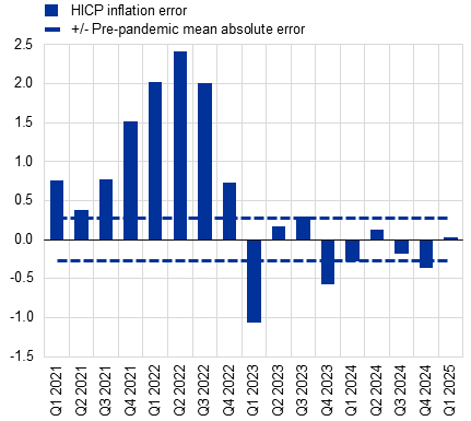 In summary, projection errors have become smaller since the second half of 2023, with the Eurosystem/ECB staff projections performing well overall, but given the ongoing shocks hitting the euro area, forecasting remains challenging. Errors were particularly large in 2021 and 2022, reflecting the impact of extraordinary and overlapping shocks. Since then forecast accuracy has improved, especially for inflation excluding energy and food, in line with the gradual dissipation of these shocks. The case of 2024 illustrates that, despite some over and underestimations, inflation projection errors have remained within historically normal bounds. That said, forecasting remains very challenging given the ongoing shocks affecting the economic outlook at both the global and euro area levels. This calls for continued caution and agility in the forecasting process, particularly in the face of high uncertainty around the evolution and transmission of these shocks.
