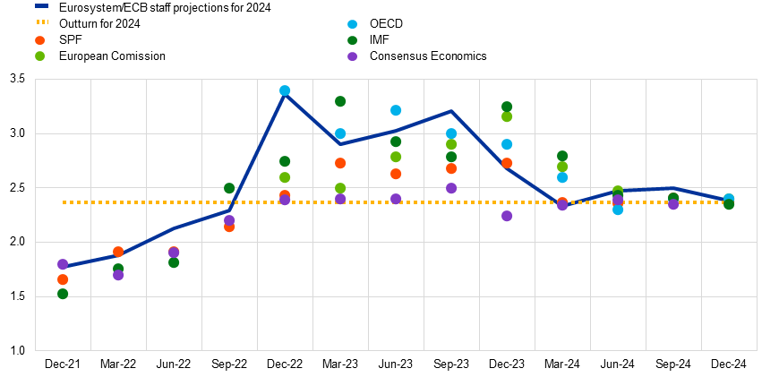 Eurosystem/ECB staff projections for annual average HICP inflation in 2024 over different vintages