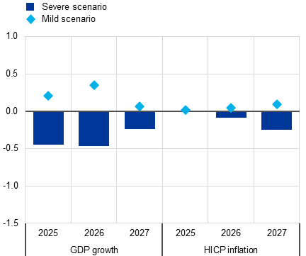 To illustrate the risks relating to US tariff policies and the current high uncertainty surrounding the euro area economic outlook, two scenarios have been prepared. A mild scenario foresees the removal of bilateral tariffs between the United States and the EU (i.e. “zero-for-zero” tariffs) and a rapid reduction in trade policy uncertainty to pre-2018 levels. Under such a scenario, growth would be 0.3-0.4 percentage points stronger in 2025-26 than in the baseline, while inflation would be marginally higher in 2026-27. A severe scenario foresees a further increase in US tariffs across the board (in line with the announcement of so-called “reciprocal” tariffs in the United States), symmetric retaliation by the EU and persistently higher trade policy uncertainty. Under such a scenario, the growth outlook would be considerably weaker throughout the projection horizon while inflation would be lower – especially later in the horizon. These scenarios are detailed in Box 2.