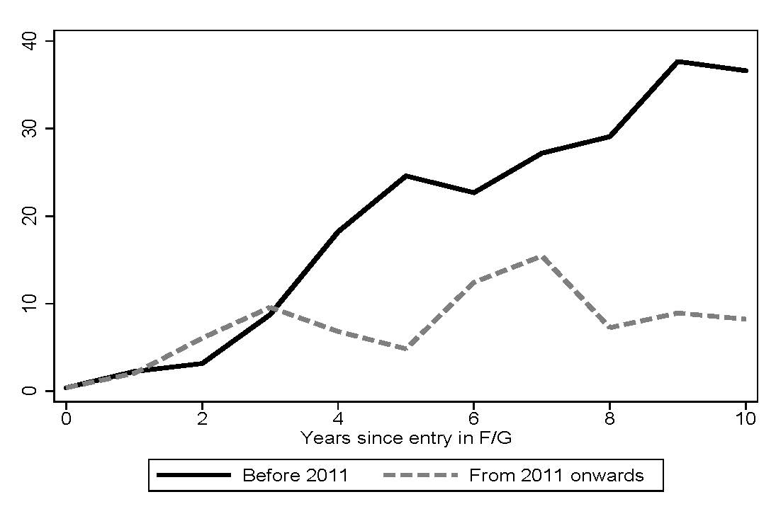 Gender gap in the probability of promotion from salary band F/G (before 2011 and from 2011 onwards)