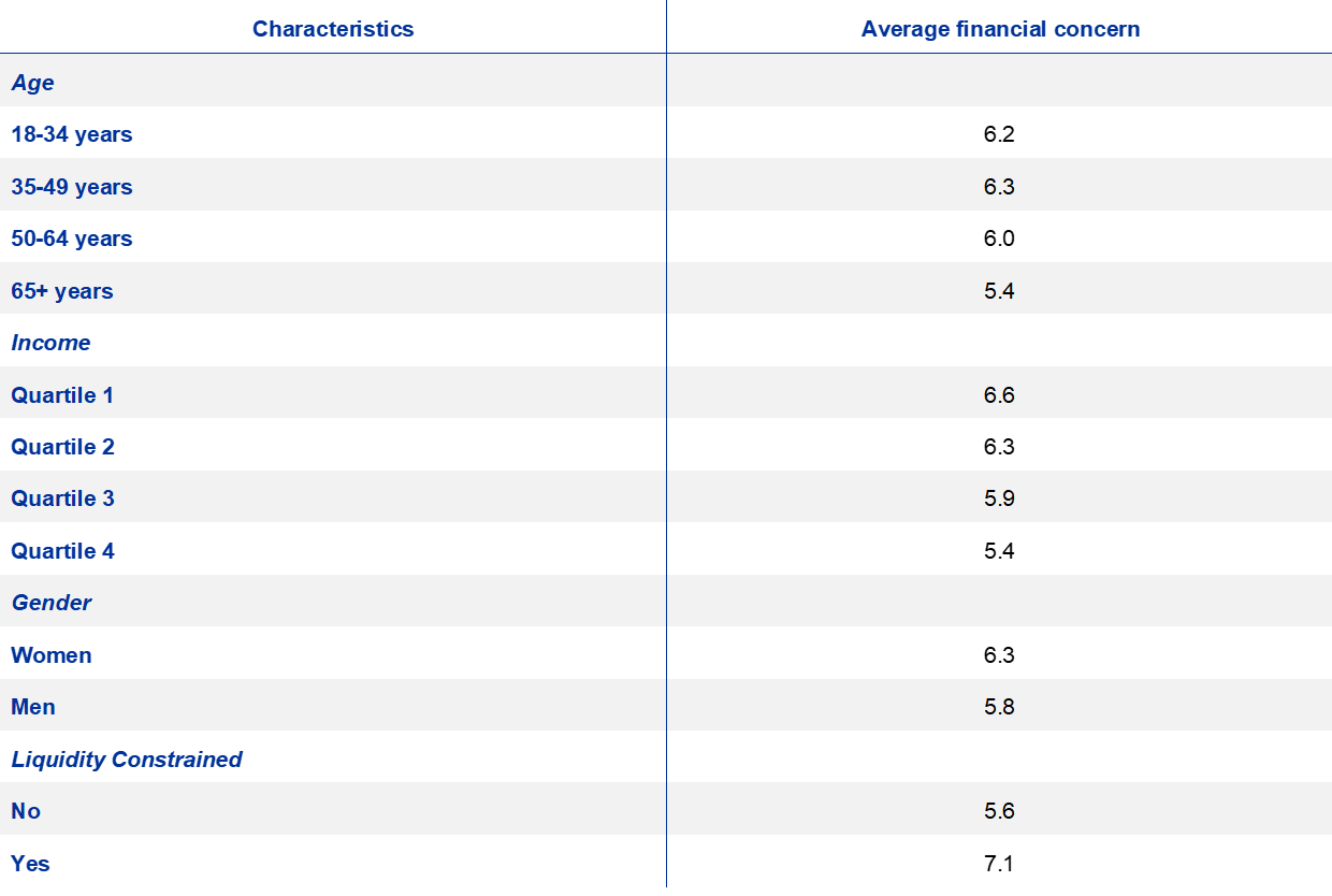 Source: ECB Consumer Expectations Survey. Using weighted data. Individual-level concerns about the household’s financial situation have been elicited on a monthly basis since April by asking: “How concerned are you about the impact of coronavirus (COVID-19) with respect to the financial situation of your household?”, with an 11-step response scale ranging from 0 (not at all concerned) to 10 (extremely concerned). Liquidity constraints are inferred from the ability of a household to meet an unexpected payment equal to one month of household income.