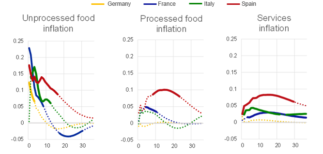 Hotter summers also have implications for core inflation (i.e. headline inflation excluding the food and energy components). We find a persistent upward response of services inflation to an increase in summer temperatures (Chart 2), but the response is smaller than for unprocessed food inflation. The increase in services inflation might be due to a change in food (commodity) prices, which, in turn, affects the prices of food services (e.g. restaurants, cafes, canteens and fast food). The tourism and recreation services sectors could be similarly vulnerable to temperature shocks, since they are labour-intensive sectors and it is well-documented in the literature that when temperatures exceed a critical threshold, there are negative effects on labour supply and productivity (Dasgupta et al., 2021).