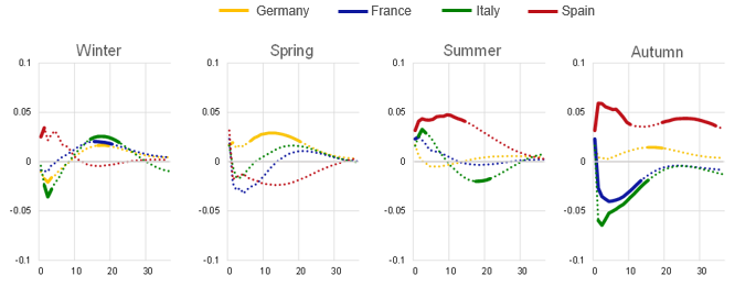 In line with the response of disaggregated inflation rates, we observe asymmetric and heterogeneous changes in euro area headline inflation as a result of weather shocks in individual countries. In summer, inflation consistently responds to temperature shocks by rising in the first few months after the shock, and the response is significant when the shocks occur in Italy and Spain (Chart 3). However, euro area headline inflation may conversely decrease when temperature shocks materialise in other seasons of the year, depending on where and when the shock occurs.